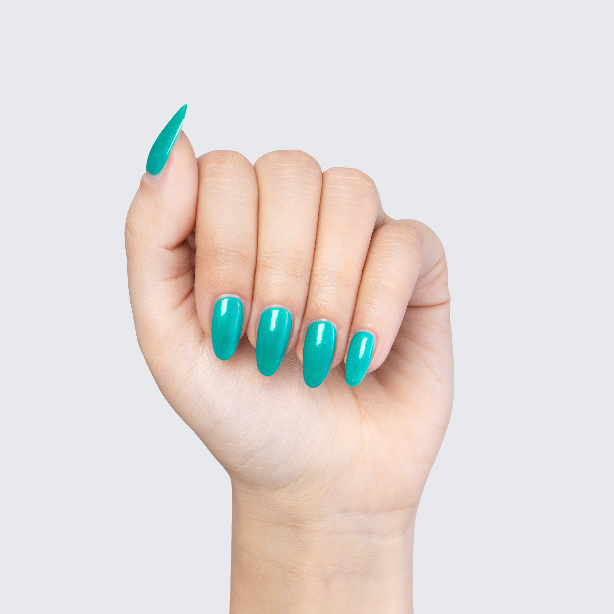Green with blue base. Medium. Bright. Pearl finish. 1 coat sheer, 2+ coats opaque. Cool undertone.